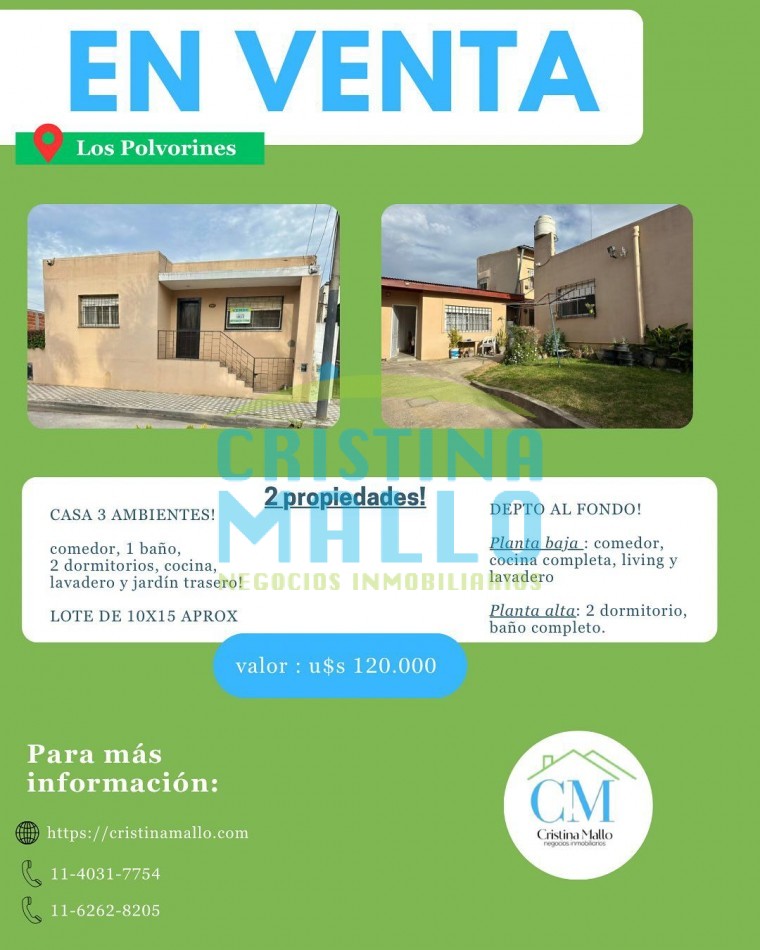 En lote de 10x15 se encuentran 2propiedades: una casa de 3 ambientes con jardín trasero y un departamento de 2 plantas con 2 dormitorios. Excelente oportunidad de inversión.